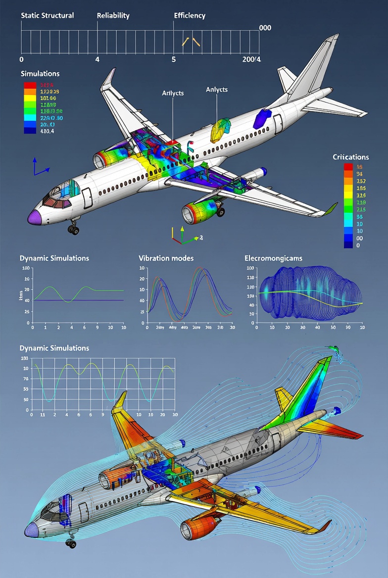 Os resultados obtidos nessas análises permitem validar o dimensionamento previamente realizado, identificar possíveis pontos críticos do projeto e promover ajustes necessários para garantir segurança, confiabilidade e eficiência. Dessa forma, a análise dinâmica reduz a necessidade de correções em fases posteriores, minimiza custos e aumenta a probabilidade de sucesso do projeto. Na figura abaixo, pode-se observar um exemplo de análise estrutural aplicada a um modelo de aeronave.